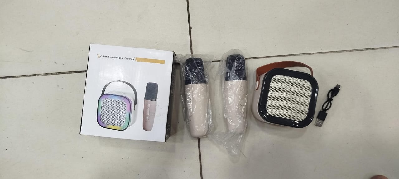 The **K12 Mini Audio Microphone Karaoke Speaker** is a compact, wireless Bluetooth speaker with a built-in microphone designed for karaoke and family entertainment. Perfect for both indoor and outdoor use, it delivers powerful sound in a portable form factor. The speaker connects easily to mobile devices via Bluetooth, allowing you to stream music and sing along anywhere. Its lightweight design and rechargeable battery make it convenient for picnics, parties, and other gatherings. Ideal for karaoke lovers and casual music play on the go.-
