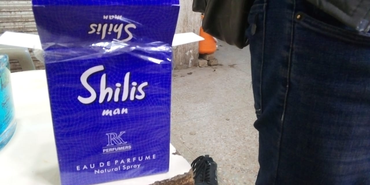 - Note: "The perfume comes in a blue box with the word "Shalis" written in white. The bottle itself is transparent with a blue-colored liquid inside, featuring a square shape and a clear cap.