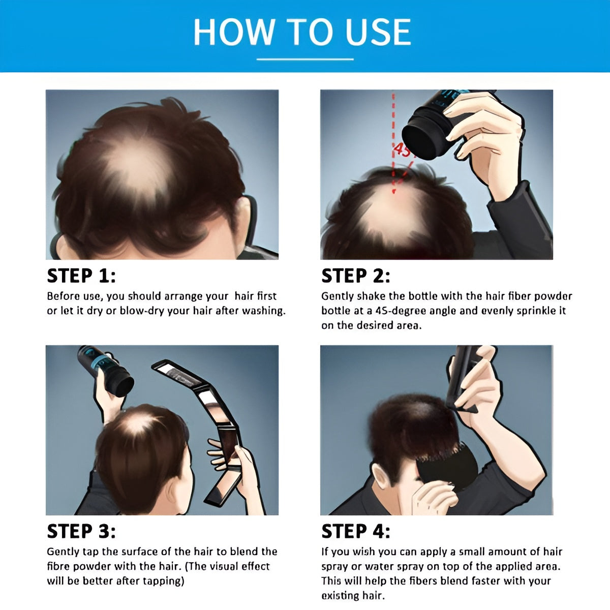 - For best effect, use on clean, dry hair. To use, simply dust liberally onto the areas you want to cover up and gently part your hair a few times to help the fibers settle into position before styling as normal. Your hair will appear much thicker, fuller & less thin, boosting confidence and helping you to focus on something other than how your hair looks.