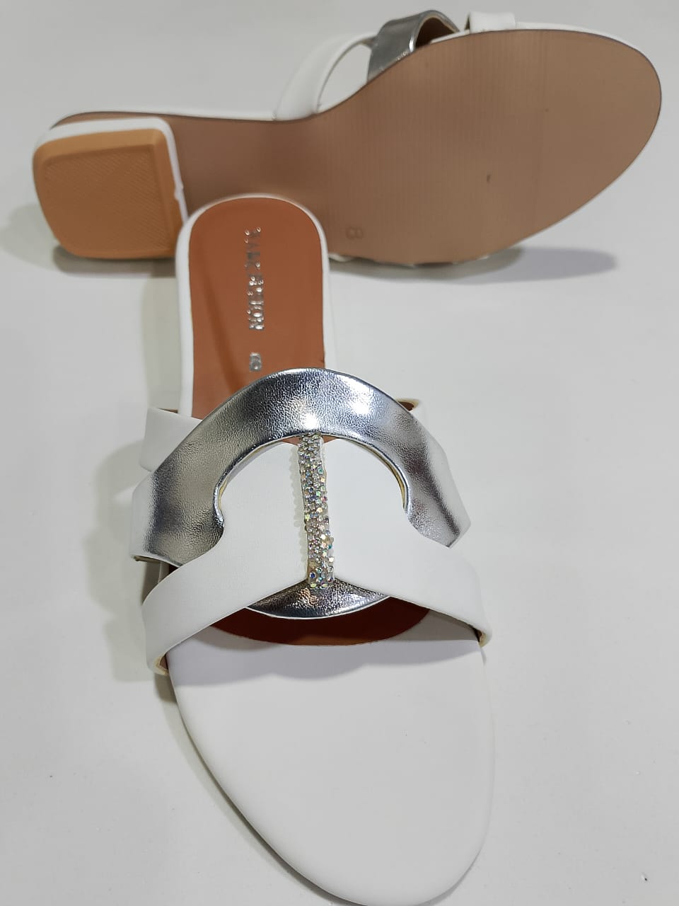 Step into effortless elegance with our Chic White Slip-On Sandals with Sparkling Silver Detail. Designed for both comfort and style, these flat sandals feature pristine white cross-over straps beautifully complemented by a striking metallic silver accent strap. The silver detail is subtly adorned with delicate, sparkling embellishments, adding a touch of understated glamour to your look. Crafted with a cushioned tan insole, these sandals promise all-day comfort, making them perfect for your daily adventures or relaxed weekend outings. The sleek, flat silhouette ensures easy wearability, while the sophisticated design makes them versatile enough to pair with anything from casual denim to flowy summer dresses. Whether you're strolling through the city or enjoying a resort getaway, these Elegant White & Silver Flat Sandals are your go-to choice for sophisticated ease. Key Features:- Design: Modern slip-on flat sandal with open-toe